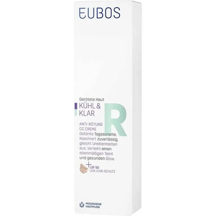 Die Eubos Kühl & Klar Anti-Rötung CC Creme ist ein medizinisches Pflegeprodukt mit hohem Lichtschutzfaktor 50. Abdeckende, hauttonkorrigierende Farbpigmente mit Blur-Effekt kaschieren Rötungen zuverlässig. Die CC-Creme ist mit einem Phyto-Aktivstoffkomplex, der Entzündungen hemmt und Rötungen reduziert. Sie ist Therapie begleitend bei Couperose und Rosacea anwendbar.