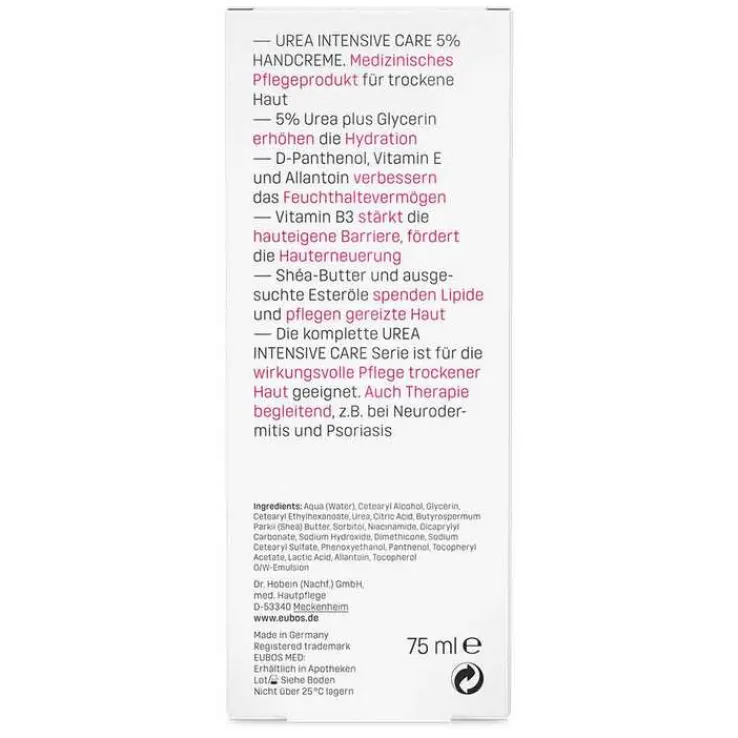 Die Eubos trockene Haut Urea Intensiv Care 5% Handcreme ist ein medizinisches Pflegeprodukt für trockene Haut. Die enthaltenen 5% Urea plus Glycerin erhöhen die Hydration. D-Panthenol, Vitamin E und Allantoin verbessern das Feuchthaltevermögen. Vitamin B3 stärkt die hauteigene Barriere und fördert die Hauterneuerung. Shea-Butter und ausgesuchte Esteröle spenden Lipide und pflegen gereizte Haut.