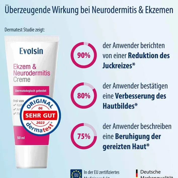 Evolsin Ekzem & Neurodermitis Creme wirkt durch eine allmähliche Abgabe von Sauerstoff und ist Corticoide- und Antibiotikafrei. Die fortgesetzte Abgabe von Sauerstoff schafft ein optimales Umfeld für die Heilung der Haut. Durch dermatologische Tests wurde die Wirksamkeit des Produkts belegt.