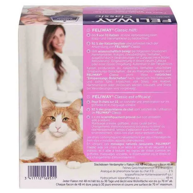 Feliway Classic ist dem natürlichen Wohlfühlpheromon der Katze nachempfunden. Als Verdampfer für die Steckdose führt es zu Wohlbefinden der Samtpfoten auf 50 – 70m² Wohnfläche. Der Bereich wird zur Wohlfühloase und stressbedingte Verhaltensweisen, wie z.B. Harn- oder Kratzmarkieren, nehmen ab.