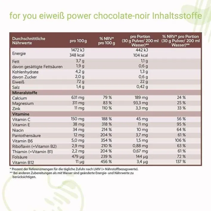 Neben den Hauptbestandteilen Milcheiweiß, Sojaprotein, Molkenprotein, Hühnerei-Eiweißpulver und mikroverkapseltem L-Carnitin sind auch wichtige Vitamine & Mineralien im Eiweiss Isolat Pulver. Neben Calcium und Magnesium ist Zink ein wichtiger Bestandteil der Rezeptur. Zink beeinflusst den Stoffwechsel & viele weitere biochemische Prozesse des Körpers und ist elementar für Immunsystem, Haut und Haare. Eine hochwertige und sorgfältig ausgewählte Mischung aus B-Vitaminen, Vitamin C und Vitamin E rundet das For You Eiweiss Power ab.