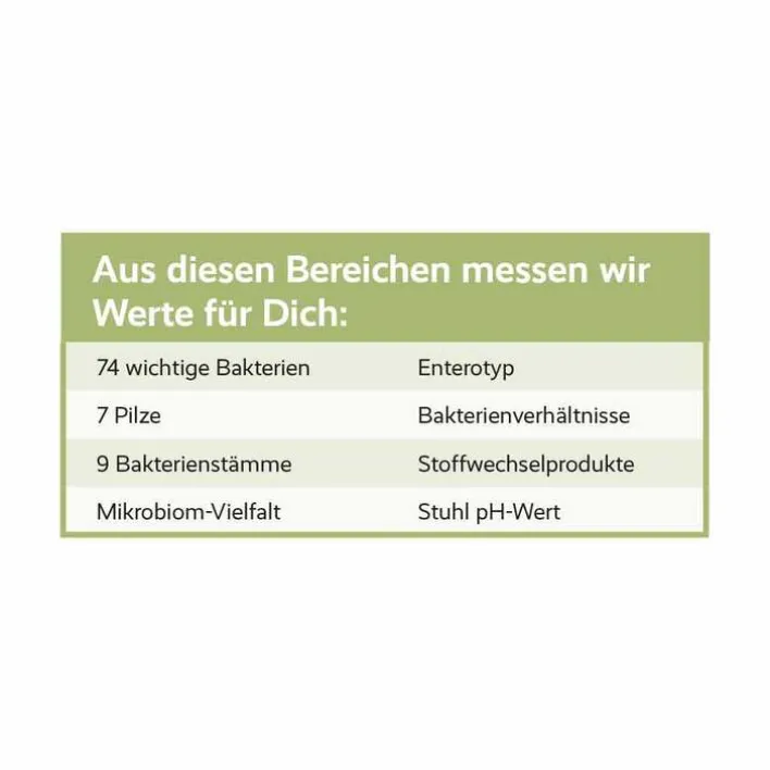 Der Mikrobiom Test analysiert die Mikrobiom Vielfalt, 74 wichtige Bakterien, 7 Pilze sowie Deinen Enterotyp, Stuhl pH-Wert und weitere wichtige Marker für Deine Darmgesundheit.