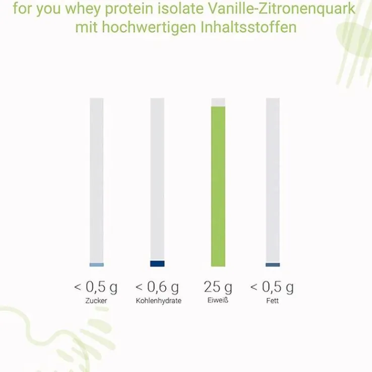 for you whey protein isolate Vanille-Zitronenquark ist ein sehr hochwertiges Molkenproteinisolat. Es wurde im Mikrofiltrationsverfahren hergestellt und ist somit sehr rein. Es enthält ausschließlich Molkenproteinisolat, mit einem Anteil von 97,5% und ist überaus kohlenhydratarm und fettarm. Angereichert mit Zink und 9 weiteren Vitalstoffen ist es noch wertvoller für den Körper. Aufgrund des sehr geringen Kohlenhydratgehalts ist das Isolat auch ideal während einer Low-Carb Diät.