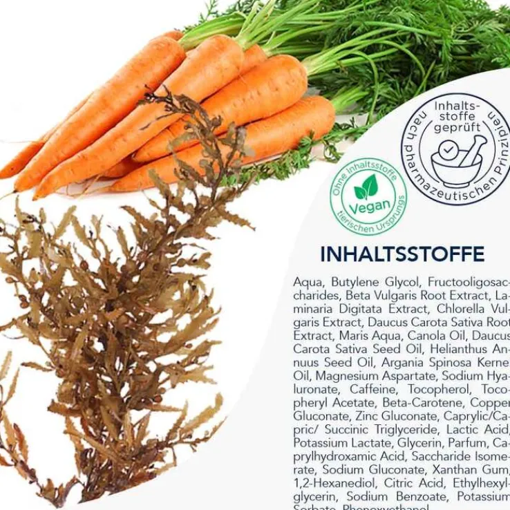 - mit Algen-Extrakt (Braun- und Grünalge), Arganöl, Beta-Carotin, Fructooligosaccharide, Glycerin, Hyaluron (langkettig), Karotten-Extrakt, Karottensamenöl, Rote Beete-Extrakt, Tiefseewasser, Vitamin E