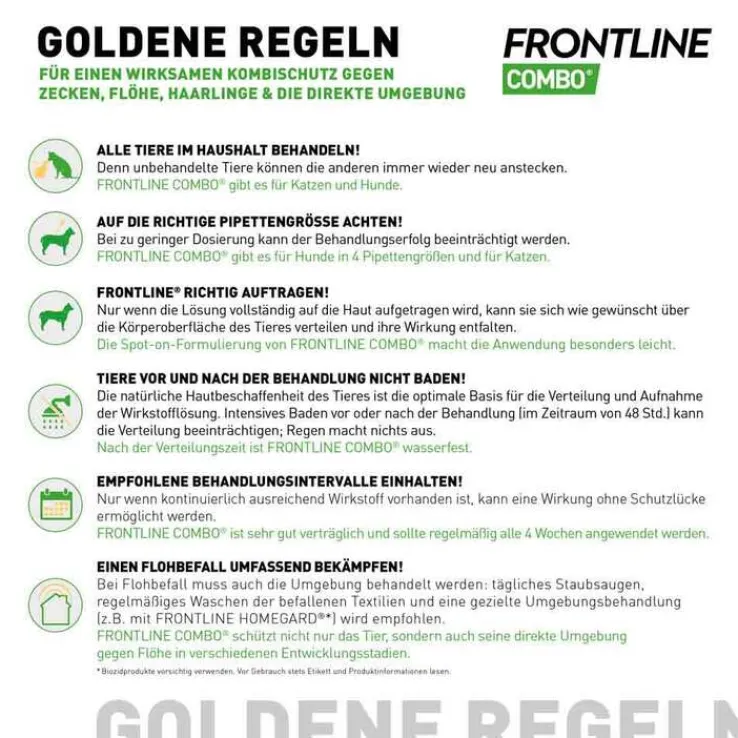 Aufgrund des Wirkprinzips von FRONTLINE COMBO® ist es möglich, dass vorübergehend lebende Zecken auf dem Tier sichtbar sind, die den Hund neu befallen haben. Sie werden jedoch unschädlich gemacht, sobald ausreichend Wirkstoff durch den Panzer eingedrungen ist. Werden Flöhe auf dem Tier entdeckt, haben Floheier, -larven und -puppen meist schon die Umgebung befallen. FRONTLINE COMBO® hemmt durch seine Wirkstoffkombination zusätzlich die Entwicklung der Flohpopulation im eigenen Zuhause. Um den gesamten Flohzyklus zu unterbrechen, empfiehlt sich ergänzend eine gezielte Umgebungsbehandlung, beispielsweise durch tägliches Staubsaugen und Waschen der befallenen Textilien. Durch ein Umgebungsprodukt (z.B. FRONTLINE HOMEGARD®) kann der Flohbefall so noch schneller bekämpft werden.