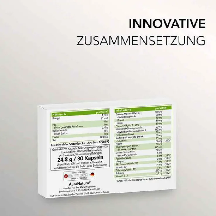 Bacopa-Monnieri-Extrakt, Kapselhülle (Hydroxypropylmethylcellulose, Farbstoff Kupferkomplexe der Chlorophylle), Füllstoff Akazienfaser (Gummi arabicum), L-Tyrosin, Ginkgonuss-Pulver, L-Serin, Phosphatidylcholin (aus Sojaerzeugnissen), Sibirischer-Ginseng-Extrakt, CrataegusLaevigata-Extrakt, L-Glutamin, Mangangluconat, Nicotinamid (2,15 %), Blutregenalgen-Extrakt, Grüner-Tee-Extrakt, Calcium-D-Pantothenat, Cyanocobalamin (0,36 %), Pyridoxinhydrochlorid (0,28 %), Thiaminhydrochlorid (0,26 %), Ribofl avin (0,2 %), Folsäure.