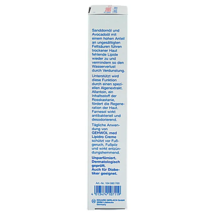 Gehwol med Lipidro Creme gleicht mit seinen hochwertigen Inhaltsstoffen den Mangel an Lipiden sowie Feuchtigkeit aus und bringt so die Schutzfunktion der Haut ins natürliche Gleichgewicht. Mit dem enthaltenen Harnstoff wird Wasser in tieferen Hautschichten gebunden, vorhandene Hornhaut wird erweicht und übermäßige Neubildung reduziert.