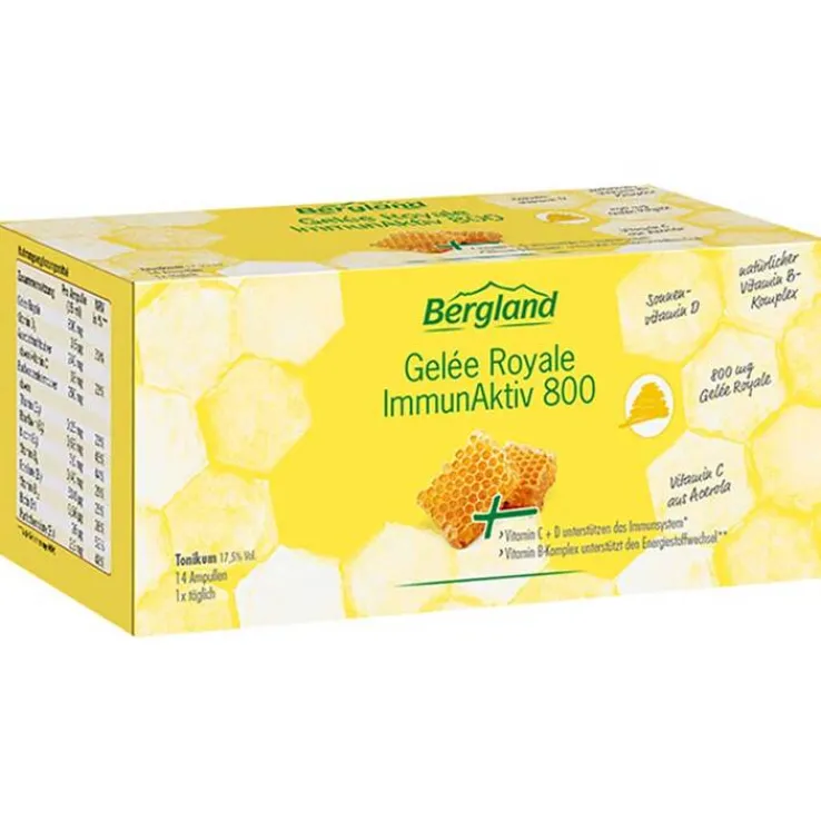 Gelée Royale ImmunAktiv 800 ist ein hochwertiges Nährstoff-Tonikum aus 800 mg Gelée Royale und wichtigen Vitaminen für die tägliche Abwehrstärke und Energie. Gelée Royale ist das Nahrungselixier der Bienenkönigin und eine einzigartige Kombination aus Blütenpollen, Honigtau und Nektar. Für Gelée Royale ImmunAktiv 800 ist es kombiniert mit natürlichem Vitamin C aus der Acerolafrucht und dem Sonnenvitamin D für die normale Immunabwehr. Ein natürlicher Vitamin B-Komplex aus gekeimtem Buchweizen unterstützt darüber hinaus den täglichen Energiestoffwechsel des Körpers.