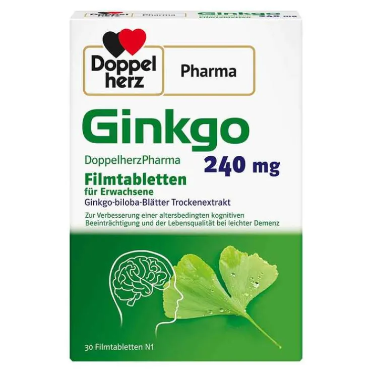 Doppelherz Ginkgo 240 mg Filmtabletten. Für Erwachsene. Wirkstoff: Ginkgo-biloba-Blätter Trockenextrakt. Anwendungsgebiete: Pflanzliches Arzneimittel zur Verbesserung einer altersbedingten kognitiven Beeinträchtigung und der Lebensqualität bei leichter Demenz. Warnhinweise: Enthält Lactose und Glucose. Zu Risiken und Nebenwirkungen lesen Sie die Packungsbeilage und fragen Sie Ihre Ärztin, Ihren Arzt oder in Ihrer Apotheke. Stand 12/2022