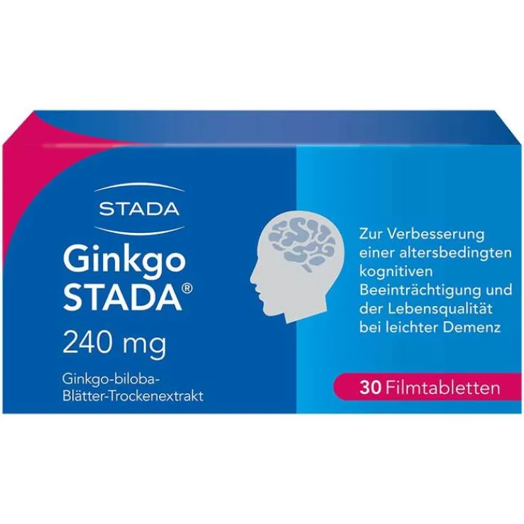 Ginkgo STADA® 240 mg Filmtabletten. Zur Anwendung bei Erwachsenen. Wirkstoff: Ginkgo-biloba-Blätter-Trockenextrakt. Ginkgo STADA® ist ein pflanzliches Arzneimittel zur Verbesserung einer altersbedingten kognitiven Beeinträchtigung und der Lebensqualität bei leichter Demenz. Enthält Lactose und Glucose. Zu Risiken und Nebenwirkungen lesen Sie die Packungsbeilage und fragen Sie Ihre Ärztin, Ihren Arzt oder in Ihrer Apotheke. Zulassungsinhaber: STADAPHARM GmbH, Stadastraße 2–18, 61118 Bad Vilbel. Vertrieb: STADA Consumer Health Deutschland GmbH, Stadastraße 2–18, 61118 Bad Vilbel. Stand: Juli 2020