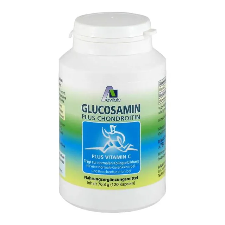 Nahrungsergänzungsmittel mit 250 mg Glucosamin und 250 mg Chondroitin pro Kapsel, kombiniert mit 15 mg Vitamin C.