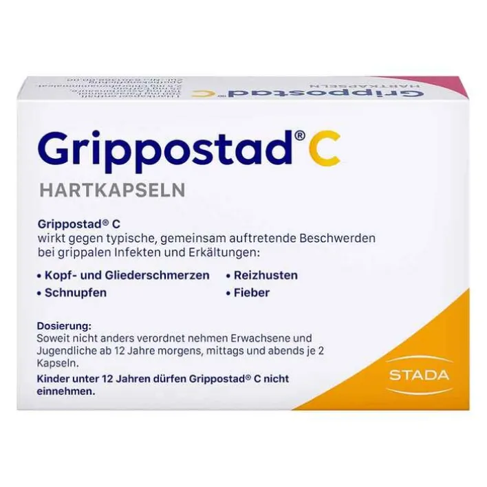 Pflichtangaben: Grippostad® C HARTKAPSELN Wirkstoffe: Paracetamol, Ascorbinsäure (Vitamin C), Coffein, Chlorphenaminmaleat. Zur symptomatischen Behandlung von gemeinsam auftretenden Beschwerden wie Kopf- und Gliederschmerzen, Schnupfen und Reizhusten im Rahmen einer einfachen Erkältungskrankheit bei Erwachsenen und Jugendlichen ab 12 Jahren. Bei gleichzeitigem Fieber oder erhöhter Körpertemperatur wirkt Grippostad® C fiebersenkend. Durch die fixe Kombination der Wirkstoffe in Grippostad® C kann bei Beschwerden, die überwiegend eines der genannten Symptome betreffen, keine individuelle Dosisanpassung vorgenommen werden. In solchen Situationen sind Arzneimittel in anderer Zusammensetzung vorzuziehen. Hinweis: Enthält: Lactose. Schmerzmittel sollen über längere Zeit oder in höheren Dosen nicht ohne Befragen des Arztes eingenommen werden. Ohne ärztlichen Rat nicht länger anwenden als in der Packungsbeilage vorgegeben! Zu Risiken und Nebenwirkungen lesen Sie die Packungsbeilage und fragen Sie Ihre Ärztin, Ihren Arzt oder in Ihrer Apotheke. STADA Consumer Health Deutschland GmbH, Stadastraße 2–18, 61118 Bad Vilbel Stand: Dezember 2024