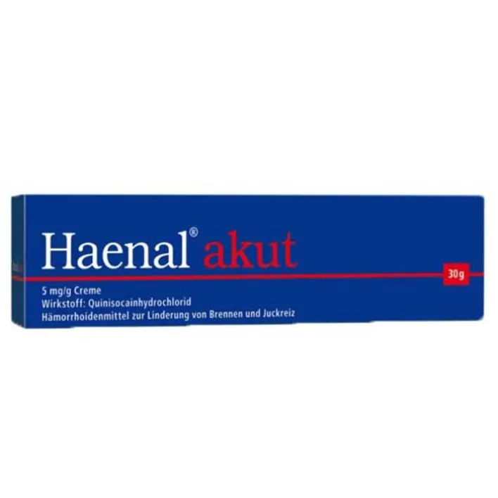 Haenal® akut. 5 mg/g Creme. Wirkstoff: Quinisocainhydrochlorid. Anwendungsgebiet: Linderung von Brennen und Juckreiz im Afterbereich. Warnhinweis: enthält Cetylalkohol und Parabene (Methyl-4-hydroxybenzoat [E 218] und Propyl-4-hydroxybenzoat [E 217]). Packungsbeilage beachten. Stand: 12.2020. Zu Risiken und Nebenwirkungen lesen Sie die Packungsbeilage und fragen Sie Ihre Ärztin, Ihren Arzt oder in Ihrer Apotheke.