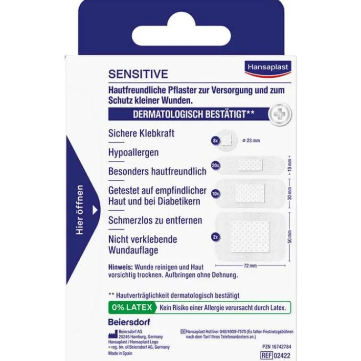 Hansaplast Sensitive Pflaster sind besonders hautfreundlich und eignen sich für alle Arten von kleineren Wunden bzw. Verletzungen. Das besonders hautfreundliche Material des Hansaplast Sensitive Pflasters ist hypoallergen und flexibel. Die nicht verklebende Wundauflage schützt und polstert die Wunde. Dank der sicheren und hautfreundlichen Klebmasse verrutscht das Pflaster nicht und lässt sich zudem auch schmerzfrei entfernen.