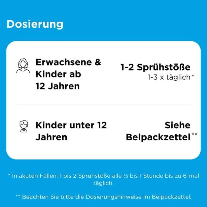 In akuten Fällen: 1 bis 2 Sprühstöße alle ½ bis 1 Stunde bis zu 6-mal täglich, aber nicht mehr als 8 Sprühstöße pro Tag.