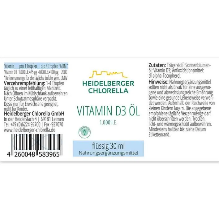Heidelberger Chlorella Vitamin D3 Öl Tropfen zum Einnehmen, 30 ml> Vitamin D (Colecalciferol)