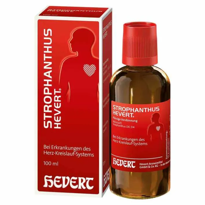 Strophanthus Hevert. Die Anwendungsgebiete leiten sich von den homöopathischen Arzneimittelbildern ab. Dazu gehören: Besserung des Befindens bei nervös bedingten funktionellen Herz-Kreislaufbeschwerden. Enthält 49 Vol.-% Alkohol. Zu Risiken und Nebenwirkungen lesen Sie die Packungsbeilage und fragen Sie Ihre Ärztin, Ihren Arzt oder in Ihrer Apotheke.