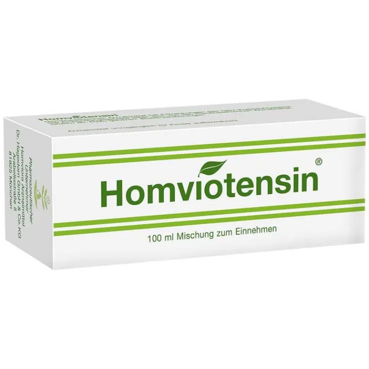 Homviotensin® Mischung. Anwendungsgebiete: Die Anwendungsgebiete leiten sich von den homöopathischen Arzneimittelbildern ab. Dazu gehören Blutdruckstörungen. Wirkstoffe: Cactus Dil. D1, Viscum album Urtinktur, Rauwolfia Dil. D3, Crataegus Urtinktur. Dosierung: Soweit nicht anders verordnet: Erwachsene nehmen 1–3–mal täglich 5 Tropfen ein. Gegenanzeigen: Wegen des Alkoholgehaltes darf Homviotensin® bei Leberkranken, Epileptikern, bei Personen mit organischen Erkrankungen des Gehirns nur nach Rücksprache mit dem Arzt angewendet werden. Von Kindern und Jugendlichen unter 18 Jahren darf Homviotensin® nicht eingenommen werden. Besondere Vorsicht ist erforderlich: Ein gesundheitliches Risiko besteht u.a. bei Leberkranken, Alkoholkranken, Epileptikern, Hirnkranken oder Hirngeschädigten sowie für Schwangere, Kinder und Jugendliche unter 18 Jahre. Als maximale Tagesabgabe nach der Dosierungsanleitung werden 0,2 g Alkohol zugeführt. Nebenwirkungen: Es können Magen-Darm-Beschwerden oder allergische Reaktionen (z. B. Hautausschlag) auftreten. Diese Beschwerden klingen in der Regel nach Absetzen des Arzneimittels innerhalb weniger Tage ab. Warnhinweis: Dieses Arzneimittel enthält 54 Vol.-% Alkohol. Apothekenpflichtig. Pharmazeutischer Unternehmer: Homviora Arzneimittel Dr. Hagedorn GmbH & Co. KG, Arabellastr. 5, 81925 München, Deutschland. Zu Risiken und Nebenwirkungen lesen Sie die Packungsbeilage und fragen Sie Ihre Ärztin, Ihren Arzt oder in Ihrer Apotheke.