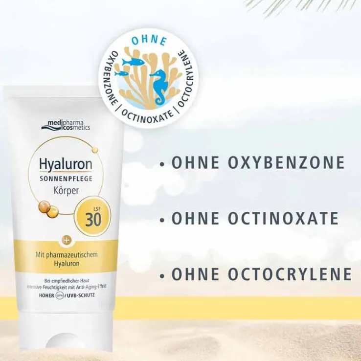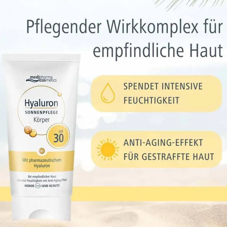 Die Hyaluron Sonnenpflege Körper LSF 30 von medipharma cosmetics bietet empfindlicher und trockener Haut zuverlässigen Schutz und intensive Feuchtigkeitspflege bei starker Sonneneinstrahlung.