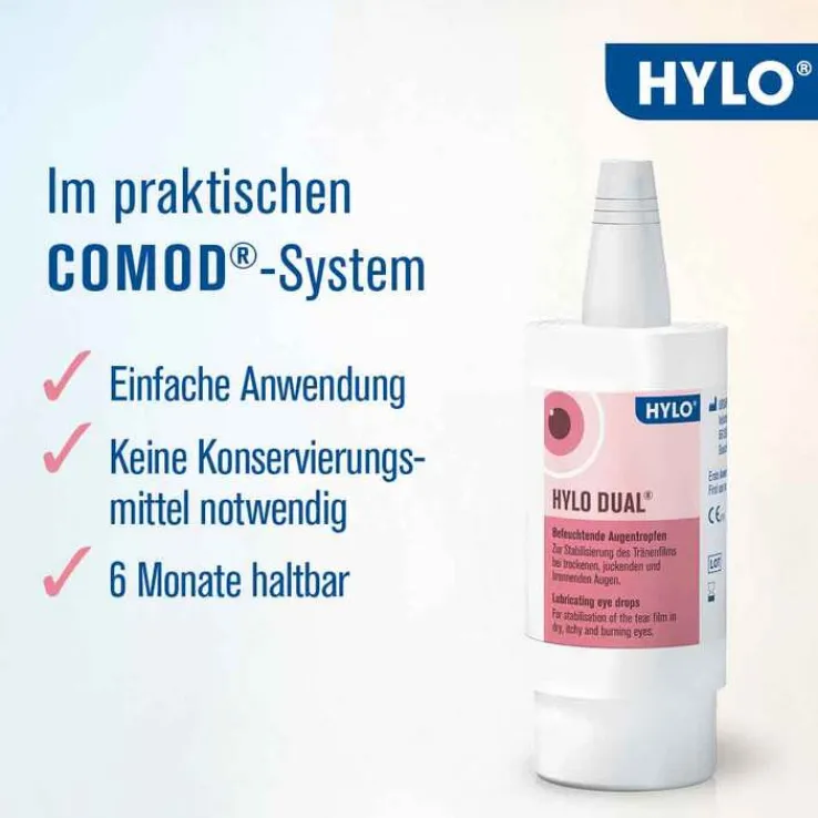 HYLO DUAL® befeuchtet Hornhaut und Bindehaut und schützt vor übermäßiger Verdunstung des Tränenfilms. Augenreizungen, die durch trockene Augen oder Allergien hervorgerufen werden, können durch die Stabilisierung des Tränenfilms gelindert werden. Die Dosierung der Augentropfen sollte gemäß der augenärztlichen Empfehlung erfolgen. Im Allgemeinen wird 3-mal täglich je 1 Tropfen HYLO DUAL® in das Unterlid jeden Auges getropft. Bei stärkeren Beschwerden oder falls täglich eine sehr häufige Anwendung notwendig ist, konsultieren Sie bitte Ihre Augenärztin bzw. Ihren Augenarzt.