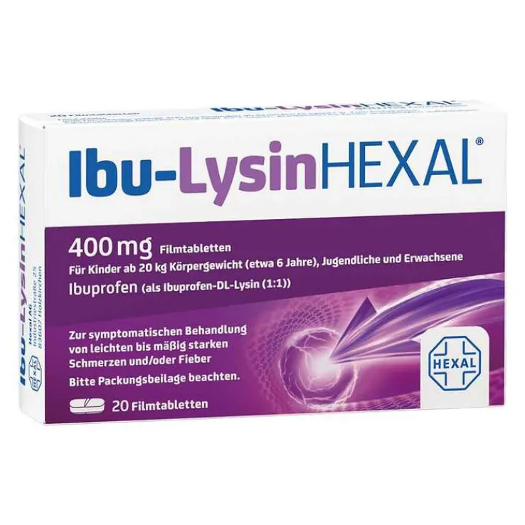 Ibu-Lysin HEXAL® 400 mg Filmtabletten, Wirkstoff: Ibuprofen (als Ibuprofen-DL-Lysin (1:1)). Anwendungsgebiete: Symptomatische Behandlung von leichten bis mäßig starken Schmerzen wie Kopfschmerzen, Zahnschmerzen, Regelschmerzen sowie Fieber und Schmerzen im Zusammenhang mit Erkältungen. Symptomatische Behandlung der akuten Kopfschmerzphase bei Migräne mit oder ohne Aura. Zur Anwendung bei Kindern ab 20 kg Körpergewicht (etwa 6 Jahre), Jugendlichen und Erwachsenen. Warnhinweis: Bei Schmerzen oder Fieber ohne ärztlichen Rat nicht länger anwenden als in der Packungsbeilage vorgegeben! Zu Risiken und Nebenwirkungen lesen Sie die Packungsbeilage und fragen Sie Ihre Ärztin, Ihren Arzt oder in Ihrer Apotheke! Mat.-Nr.: 2/51016383 Stand: Januar 2024 Hexal AG, 83607 Holzkirchen, www.hexal.de