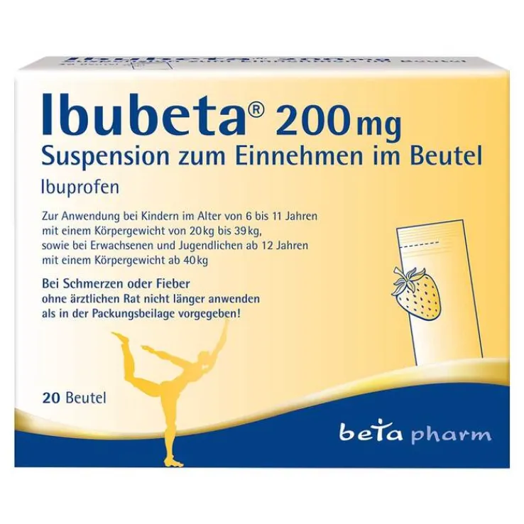 Ibubeta® 200 mg Suspension zum Einnehmen im Beutel lindert leichte bis mäßig starke Schmerzen wie z.B. Kopfschmerzen, Zahnschmerzen, Unterleibsschmerzen währen der Periode. Es lindert Entzündungen und senkt Fieber.