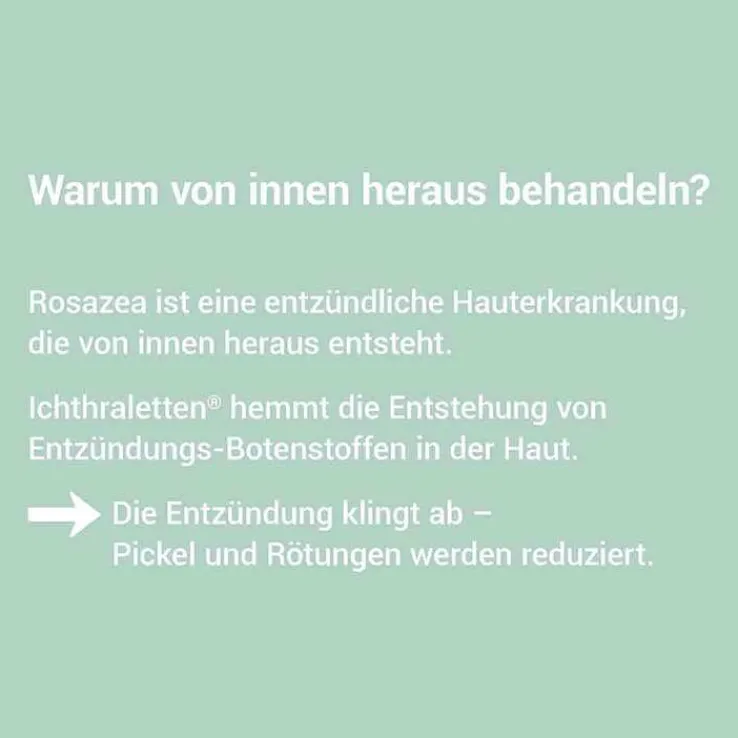 Ichthraletten®. Wirkstoff: Natriumbituminosulfonat, Trockensubstanz Anwendungsgebiete: Ichthraletten®, Tabletten sind geeignet zur Behandlung von Rosazea auch mit krankhafter Talgdrüsenüberproduktion der Haut (Seborrhoe). Enthält Lactose und Saccharose (Zucker). Zu Risiken und Nebenwirkungen lesen Sie die Packungsbeilage und fragen Sie Ihre Ärztin, Ihren Arzt oder in Ihrer Apotheke. Ichthyol-Gesellschaft Cordes, Hermanni & Co. (GmbH & Co.) KG, 22335 Hamburg