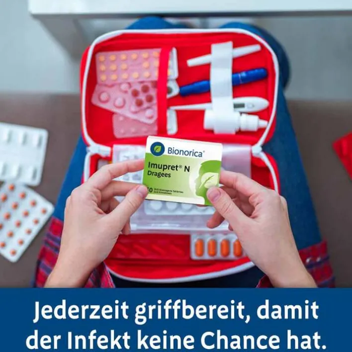Imupret® N Dragees. Traditionell verwendet bei ersten Anzeichen und während einer Erkältung, z. B. Kratzen im Hals, Halsschmerzen, Schluckbeschwerden, Hustenreiz. Hinweis: Imupret® N ist ein traditionelles pflanzliches Arzneimittel, das ausschließlich aufgrund langjähriger Anwendung für das Anwendungsgebiet registriert ist. Imupret® N Dragees wird angewendet bei Kindern ab 6 Jahren, Jugendlichen und Erwachsenen. Imupret® N Dragees enthalten Glucose, Lactose, Sucrose (Zucker). Zu Risiken und Nebenwirkungen lesen Sie die Packungsbeilage und fragen Sie Ihre Ärztin, Ihren Arzt oder in Ihrer Apotheke. BIONORICA SE | 92308 Neumarkt Nur in der Apotheke erhältlich. Stand: 01|24