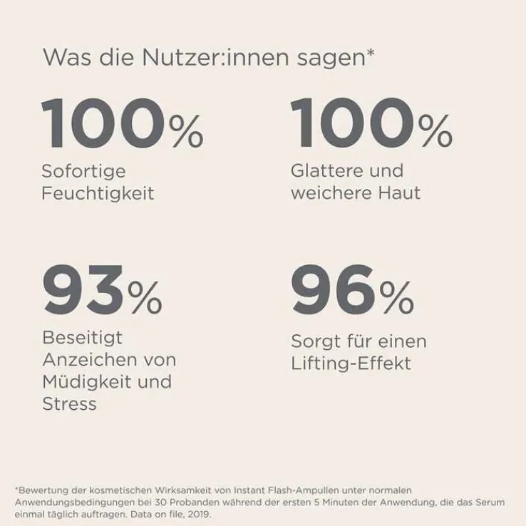 ¹ Bewertung der kosmetischen Wirksamkeit von Instant-Flash-Ampullen unter normalen Anwendungsbedingungen bei 30 Probanden während der ersten 5 Minuten der Anwendung, wobei das Serum einmal täglich aufgetragen wurde. Daten liegen vor, 2019.