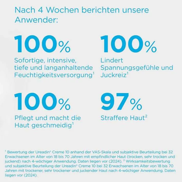 ² Auswertung der VAS-Skala für Pruritus und subjektive Beurteilung von Ureadin Creme 10 bei 32 Erwachsenen im Alter von 18 bis 70 Jahren mit empfindlicher Haut (trocken, sehr trocken und juckend) nach 4-wöchiger Studie. Daten liegen vor, 2024.