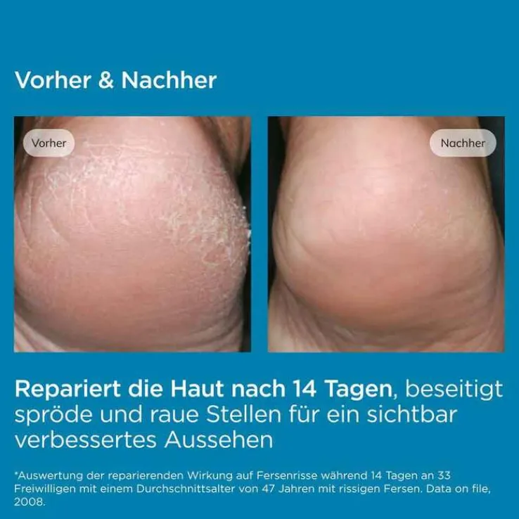¹ Auswertung der reparierenden Wirkung auf Fersenrisse über 14 Tage an 33 Freiwilligen mit einem Durchschnittsalter von 47 Jahren mit Fersenrissen. Data on file, 2008.