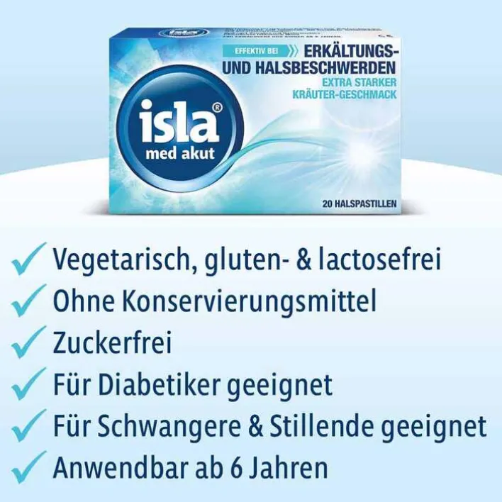 Die isla® med akut Halspastillen setzen an der Ursache erkältungsbedingter Halsbeschwerden an: der trockenen und gereizten Mund- und Rachenschleimhaut. Mit ihrer Hydro+ Formel aus einem HydrogelKomplex mit Hyaluronsäure und einem Spezialextrakt aus Isländisch Moos legen die Pastillen einen doppelten Schutfilm über die gereizte Schleimhaut, der diese intensiv befeuchtet und gegen äußere Irritationen (Krankheitserreger etc.) abschirmt. Unter diesem Schutzfilm kann sich die Schleimhaut in Mund und Rachen wieder regenerieren und erkältungsbedingte Symptome wie Halsschmerzen und Schluckbeschwerden werden effektiv und nachhaltig gelindert – und das, ohne zu betäuben.