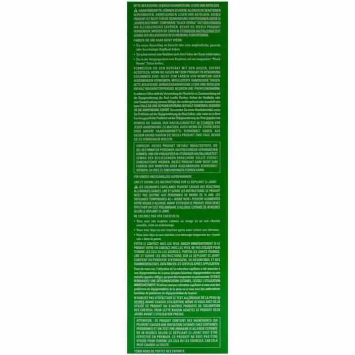 Vermeiden Sie Kontakt mit den Augen, sofort ausspülen, wenn die Augen mit dem Produkt in Berührung gekommen sind. Nicht zum Färben von Wimpern oder Augenbrauen anwenden. Mitgelieferte Handschuhe tragen. Enthält Wasserstoffperoxid.