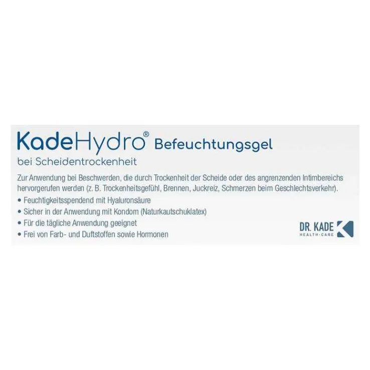 KadeHydro Befeuchtungsgel mit Hyaluronsäure spendet intensive Feuchtigkeit und lindert Beschwerden von Trockenheit der Vagina und dem angrenzenden Intimbereich. Mit dem Applikator kann das Hydrogel einfach vaginal angewendet werden. Besonders geeignet bei leichten bis mäßigen, vaginalen Beschwerden im Intimbereich etwa bei Schmerzen beim Sex, Brennen, Juckreiz oder einem wunden Gefühl rund um den Scheideneingang. Der befeuchtende, schützende Gelfilm vermittelt einen angenehmen Gleiteffekt.
