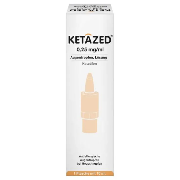 KETAZED® 0,25 mg/ml Augentropfen, Lösung. Wirkstoff: Ketotifen. Anwendungsgebiete: Antiallergikum zur Behandlung von symptomatischen Augenbeschwerden bei Heuschnupfen. Gegenanzeigen: Überempfindlichkeit gegen Ketotifen oder einen der sonstigen Bestandteile. Warnhinweis: Zu Risiken und Nebenwirkungen lesen Sie die Packungsbeilage und fragen Sie Ihre Ärztin, Ihren Arzt oder in Ihrer Apotheke. Für Erwachsene und Kinder ab 3 Jahren. Arzneimittel für Kinder unzugänglich aufbewahren. Nicht über 25 °C lagern. Apothekenpflichtig. Zulassungsinhaber: Horus Pharma, 06200 Nizza, Frankreich; Mitvertrieb: TRB Chemedica AG, Otto-Lilienthal-Ring 26, 85622 Feldkirchen, Deutschland; Stand: 02/2024