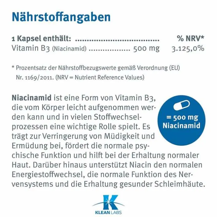 Klean Labs Niacinamid B3 500 mg Kapseln, 100 St> Vitamin B3 (Niacin)