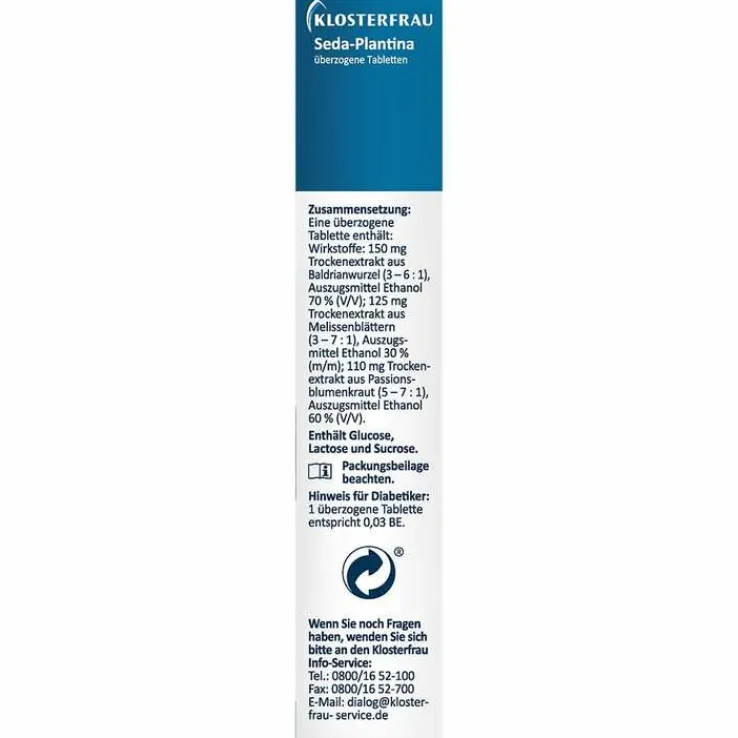 Klosterfrau Seda-Plantina überzogene Tabletten. Anwendungsgebiete: Bei Unruhezuständen und nervös bedingten Einschlafstörungen. Warnhinweise: Enthält Glucose, Lactose und Saccharose. Packungsbeilage beachten. Zu Risiken und Nebenwirkungen lesen Sie die Packungsbeilage und fragen Sie Ihre Ärztin, Ihren Arzt oder in Ihrer Apotheke.