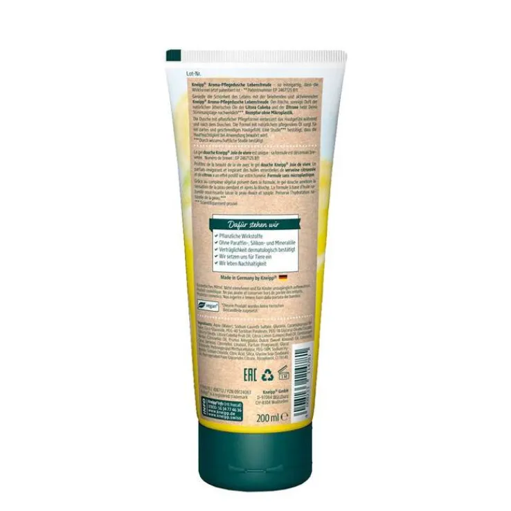Genießen Sie die Schönheit des Lebens mit der belebenden und aktivierenden Kneipp® Aroma-Pflegedusche Lebensfreude. Der frische, sonnige Duft der natürlichen ätherischen Öle der Litsea Cubeba und der Zitrone hebt Ihre Stimmungslage nachweislich*. Natürliches pflegendes Öl verwöhnt die Haut und macht sie zart und geschmeidig.