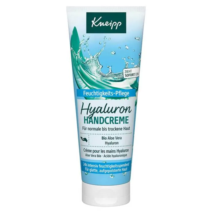 Die Kneipp Hyaluron Handcreme mit Hydro Boost Komplex aus Hyaluronsäure, wertvollem Bio Aloe Vera Extrakt und hautberuhigendem Panthenol spendet 24h intensive Feuchtigkeit, verbessert sichtbar die Hautstruktur und reduziert Fältchen.