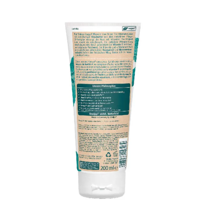 Für Ihren Kneipp Moment ohne Stress: Die nährende Lotion mit reichhaltiger Sheabutter und dem natürlichen Pflegeöl- Komplex versorgt die Haut mit intensiver Feuchtigkeit und macht sie streichelzart. Die natürliche Pflegewirkung wird abgerundet durch zellschützendes Vitamin E und hautberuhigendes Panthenol. Der klärende und erfrischende Duft mit natürlichem ätherischem Rosmarinöl und Wasserminzeextrakt helfen den hektischen Alltag hinter sich zu lassen. Goodbye Stress.