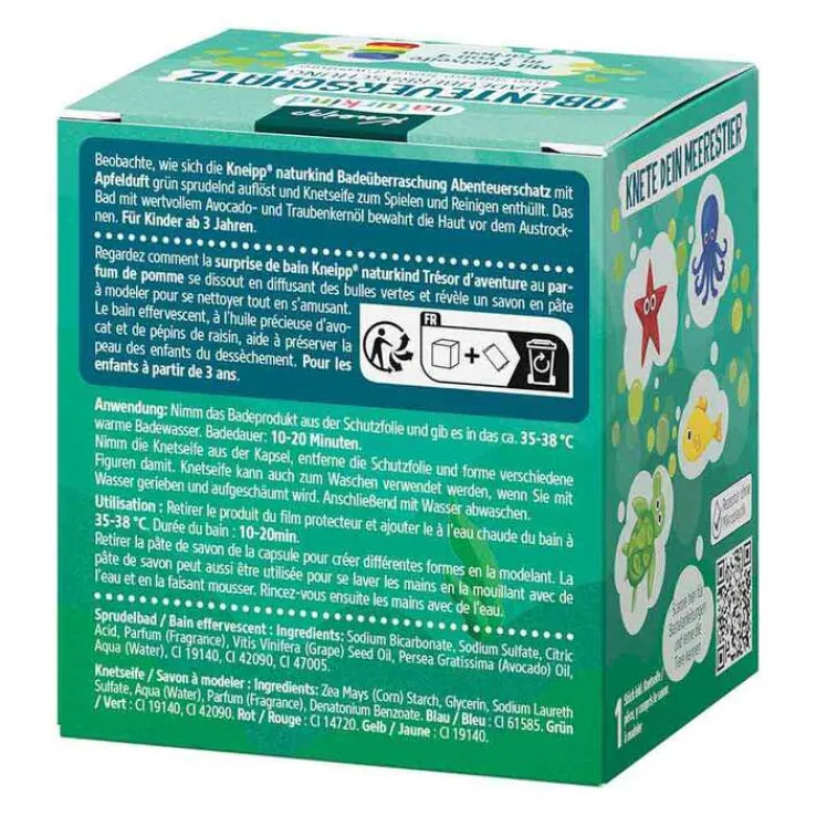 Beobachten Sie, wie sich die Kneipp naturkind Badeüberraschung Abenteuerschatz mit Apfelduft grün sprudelnd auflöst und Knetseife zum Spielen und Reinigen enthüllt. Das Bad mit wertvollem Avocado- und Traubenkernöl bewahrt die Haut vor dem Austrocknen.