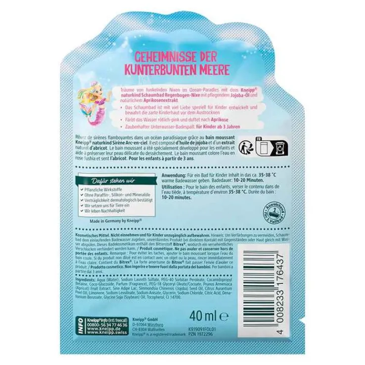 Lassen Sie unsere Kleinen von funkelnden Nixen im Ozean-Paradies träumen mit dem Kneipp naturkind Schaumbad Regenbogen-Nixe mit pflegendem Jojoba-Öl und natürlichem Aprikosenextrakt.