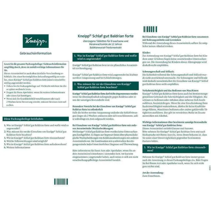 Zusammensetzung: 1 überzogene Tablette (= Dragee) Kneipp® Schlaf gut Baldrian forte enthält: Wirkstoff: 450 mg Trockenextrakt aus Baldrianwurzel (3-6:1), Auszugsmittel: Ethanol 70% (V/V).
