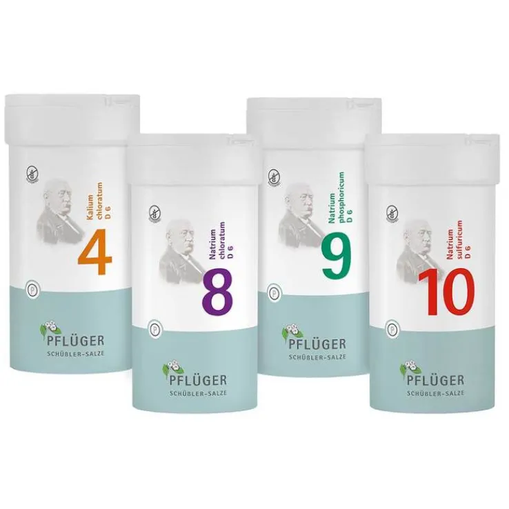 Biochemie Pflüger® Nr. 4 Kalium chloratum D6, Zusammensetzung: 1 Tablette enthält: Wirkstoff: Kalium chloratum Trit. D6 250 mg. Biochemie Pflüger® Nr. 8 Natrium chloratum D6, Zusammensetzung: 1 Tablette enthält: Wirkstoff: Natrium chloratum Trit. D6 250 mg. Biochemie Pflüger® Nr. 9 Natrium phosphoricum D6, Zusammensetzung: 1 Tablette enthält: Wirkstoff: Natrium phosphoricum Trit. D6 250 mg. Biochemie Pflüger® Nr. 10 Natrium sulfuricum D6, Zusammensetzung: 1 Tablette enthält: Wirkstoff: Natrium sulfuricum Trit. D6 250 mg. Sonstige Bestandteile: Calciumbehenat (DAB), Kartoffelstärke. Registrierte homöopathische Arzneimittel, daher ohne Angabe einer therapeutischen Indikation. Gegenanzeigen/Nebenwirkungen: Keine bekannt. Enthalten Lactose. Packungsbeilage beachten. Zu Risiken und Nebenwirkungen lesen Sie die Packungsbeilage und fragen Sie Ihre Ärztin, Ihren Arzt oder in Ihrer Apotheke. Homöopathisches Laboratorium Alexander Pflüger GmbH & Co. KG 33378 Rheda-Wiedenbrück [email protected] www.pflueger.de