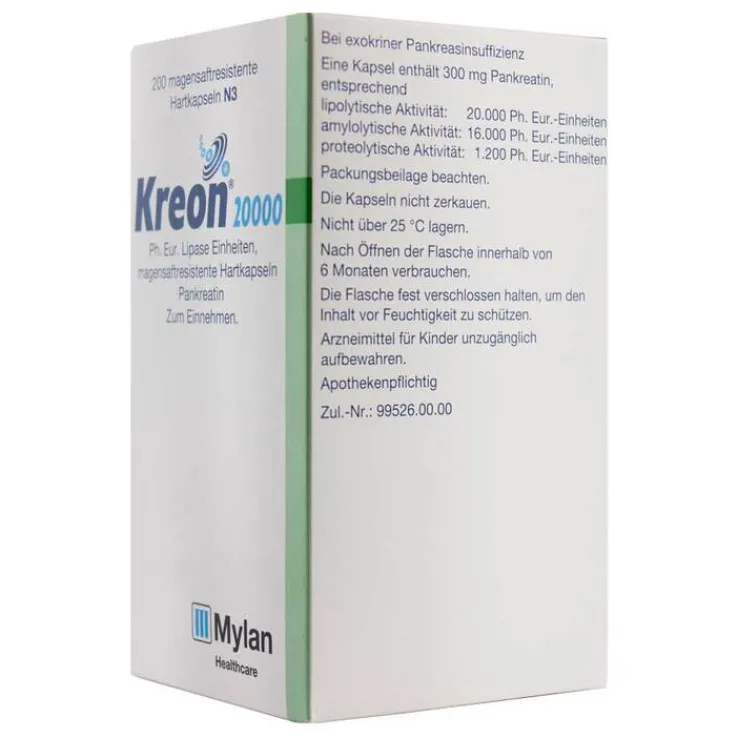 Kreon 20 000 Ph. Eur. Lipase Einheiten Wirkstoff: Pankreas-Pulver vom Schwein. Anwendungsgebiet: Pankreasenzym-Ersatzbehandlung bei exokriner Pankreasinsuffizienz aufgrund von Mukoviszidose oder anderen Zuständen (z. B. chronische Pankreatitis, Pankreatektomie oder Pankreaskrebs). Zu Risiken und Nebenwirkungen lesen Sie die Packungsbeilage und fragen Sie Ihre Ärztin, Ihren Arzt oder in Ihrer Apotheke. Mylan Healthcare GmbH