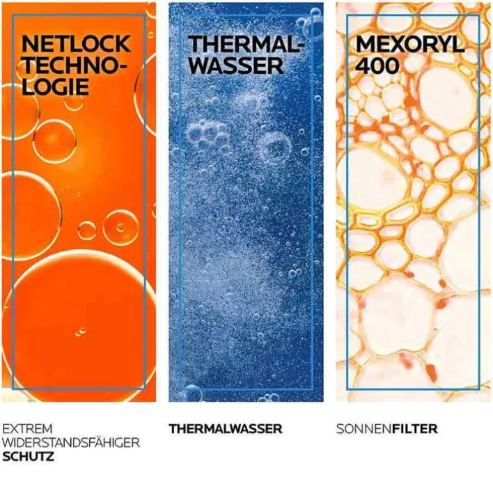 Die Creme ist für alle Hauttypen geeignet. Die Formel ist ohne Duftstoffe und spendet 24h Feuchtigkeit, pflegt und schützt trockene Haut. Sie läuft nicht in die Augen & brennt nicht in den Augen. Die hydratisierende Creme ist ultra-resistent vor Wasser, Schweiß und Sand. UVMune 400 steht für Mexoryl 400, den wirksamsten Filter gegen schädliche ultra-lange UVA-Strahlen bis 400nm.