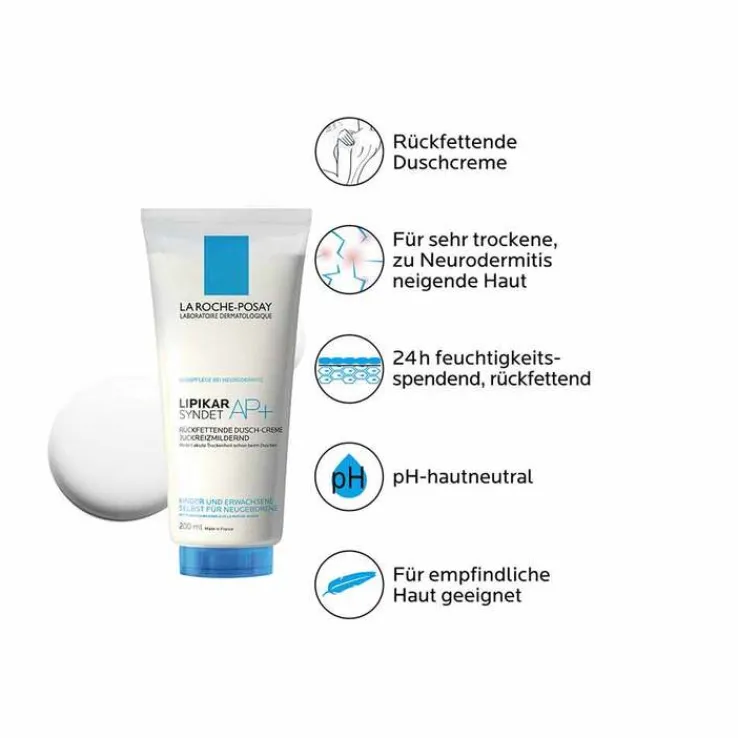 Das sanft reinigende Cremegel eignet sich als Basispflege zum Duschen bei zu Neurodermitis neigender, empfindlicher und sehr trockener Haut. Durch die rückfettende Eigenschaft wirkt die Lipikar Syndet AP+ Dusch-Creme hautberuhigend und juckreizlindernd. Es ist für Säuglinge, Kinder und Erwachsene geeignet.