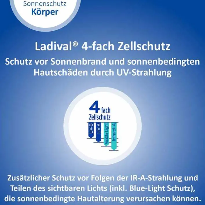 Sonnenstrahlen gibt es in verschiedenen Wellenlängen. Sie haben verschiedene Auswirkungen auf die Haut, wirken jedoch alle zellschädigend. Daher ist es wichtig einen Sonnenschutz zu verwenden, der rundum schützt. Dank einzigartigem 4-fach Zellschutz schützt das Ladival® Allergische Haut Sonnenschutz-Gel vor UV-A- und UV-B-Strahlen, vor den Folgen der Infrarot-A-Strahlung und sichtbarem Licht (einschließlich blauem Licht). So wird die Haut auch vor einer vorzeitigen, sonnenbedingten Hautalterung geschützt.