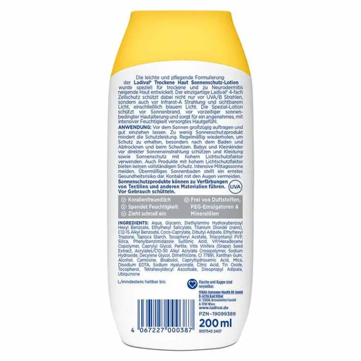 Personen mit Neurodermitis leiden oft unter sehr trockener, rauer Haut. Daher benötigen sie Produkte mit einer speziellen Rezeptur, welche dabei hilft, die Haut nicht nur zu schützen, sondern auch zu pflegen. Zusätzlich sollten Produkte gewählt werden, die keine relevanten Reizstoffe oder Kontaktallergene enthalten. Die Ladival® Trockene Haut Serie erfüllt die besonderen Ansprüche von zu Neurodermitis neigender & sehr trockener Haut. Dabei verleihen die Produkte ein angenehmes Hautgefühl, ohne zu kleben.