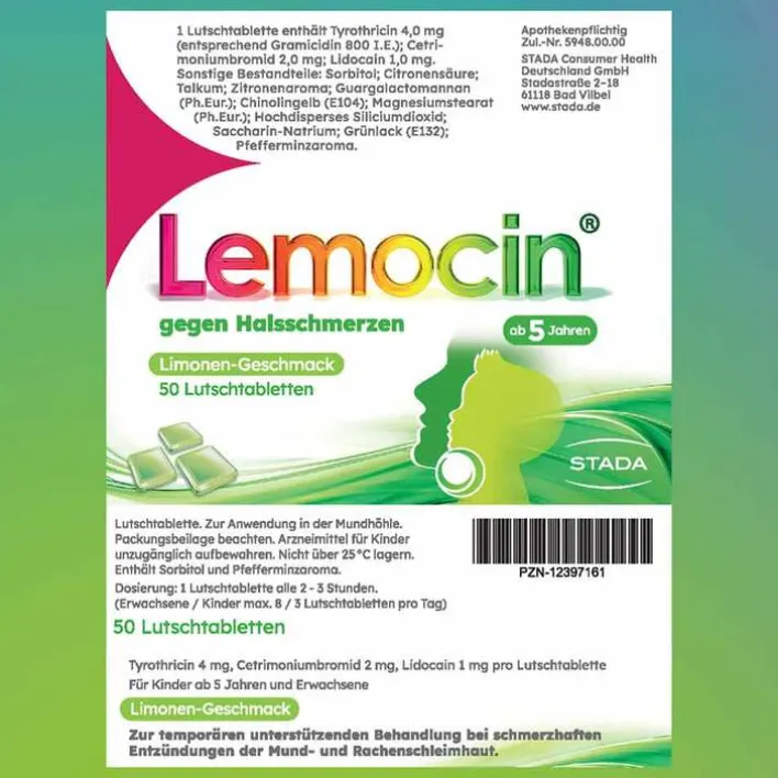 Lemocin® gegen Halsschmerzen.Tyrothricin 4 mg, Cetrimoniumbromid 2 mg, Lidocain 1 mg pro Lutschtablette. Für Kinder ab 5 Jahren und Erwachsene. Wirkstoffe: Tyrothricin, Cetrimoniumbromid, Lidocain. Zur temporären unterstützenden Behandlung bei schmerzhaften Entzündungen der Mund- und Rachenschleimhaut. Wenn Sie sich nach 2 Tagen nicht besser oder gar schlechter fühlen, wenden Sie sich an Ihren Arzt. Hinweis: Enthält Sorbitol und Pfefferminzaroma. Zu Risiken und Nebenwirkungen lesen Sie die Packungsbeilage und fragen Sie Ihre Ärztin, Ihren Arzt oder in Ihrer Apotheke. STADA Consumer Health Deutschland GmbH, Stadastraße 2–18, 61118 Bad Vilbel Stand: Juli 2023